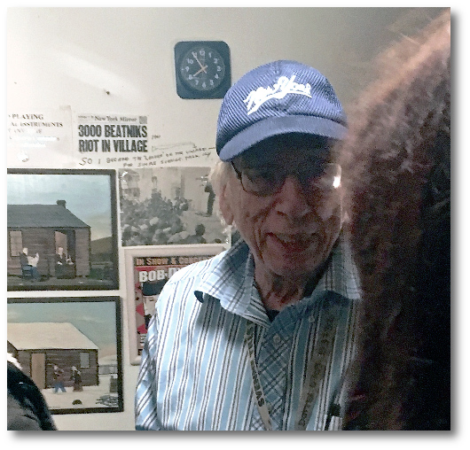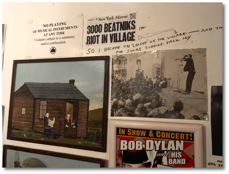 It did look like somebody’s living room with a big bookshelf – with several books on Dylan – covering the shorter of the two non-window walls while the other one was covered with posters that told the story of the folklore center. There were photos, concert posters, and notices everywhere.